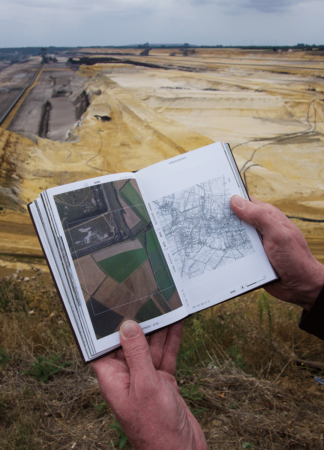 THE ATLAS OF THE IN–BETWEEN The wanderatlas shows 2 routes, based on the current state of affairs ( June 2015 ) : The Cultural Route shows the mining district "Garzweiler II" before the wandering of the brown coal mining hole [ 1955 – 2045 : From the past to the future past ]. The Re-Cultural Route shows the mining district "Garzweiler II" after the wandering of the brown coal mining hole [ 2045 – 1955 : From the future to the past future ]. Germany’s federal government approved Garzweiler II in 1995 in order to provide a constant supply of energy for the common interest. Independence of foreign supplies was a major argument for federal politicians to approve a substantial extension of the existing mining area, up-to 4.800 hectares until 2045. This means human and nature have to give way to the extraction of brown coal. Affected by this process are: 15 historical towns, about 7.000 re-settlers and the nature. Animals and insects are relocated. Infrastructure and rivers have to be redirected. The mining hole is situated in the middle of a system of numerous, concentrically arranged pumping stations. They keep the mine dry, but also affect the largest groundwater reservoir of Germany. Ecological systems, age-old landscapes and social entities such as families, communities plus the notion of home are put under enormous stress and strains. For all these consequences, the energy company RWE offers compensation. People can resettle to new villages and houses. After the mining machines have worked their way to a new territory, what’s left could be described as ‘Ground Zero’. An artificial-functional area is structured. RWE creates new farmlands and ‘recreational areas’, and nature has to start from scratch. Many and multifaceted interest groups are involved. Some parties claim that the affected area is a priceless and irreplaceable cultivated homeland; for others it is a valuable resource. Now, where the digger is, there had been my little village. There were old big trees, beautiful gardens, narrow streets. And on the right of the digger - around 200 meter behind it - there had been the house where my parents lived. Garzweiler II is located in the most densely populated and urbanized area of Germany. The economical utilization of brown coal as a resource has a history of almost 200 years in Germany. It provided the foundation for Germany’s industrial history and shaped the area, networks, traditions and people. Since then times have changed. Brown coal is one of the most inefficient energy resources. The emissions and different parties cast serious doubt on the sustainability and necessity of “Garzweiler II“. German brown coal mining has become a global issue. ‘The Wandering Hole’ sketches out the issue and urgency of finding a clarifying consensus. It conveys the extent and relative magnitude of an economic phenomenon and the emotional and ecological drama connected to it. RWE created dependency: As an employer, as a supplier and as a re-constructor. When the government approved Garzweiler II in 1995 a project was set in motion that can’t be simply brought to a halt. At a speed of 2,3 cm per hour the hole ‘wanders’ – as RWE calls it – through the landscape,resulting in a long-lasting process of transformation. Inhabitants have to deal with the consequences on a daily basis. They live in an in-between condition. Trapped between old and new. In-between recollection and hope. In-between loss and gain. In-between consent and protest. In-between independence and dependence. In-between questioning and clarity. In-between here and there. In-between was and will be. In-between past, present and future tenses. The uncertainty makes the process emotional and any frustration understandable. Until now the route of the hole is clear. So far, Garzweiler II is still moving ahead – by half a meter a day. Yet, it remains unclear how far the mining hole will wander. Here, Germany’s federal government has the final say.